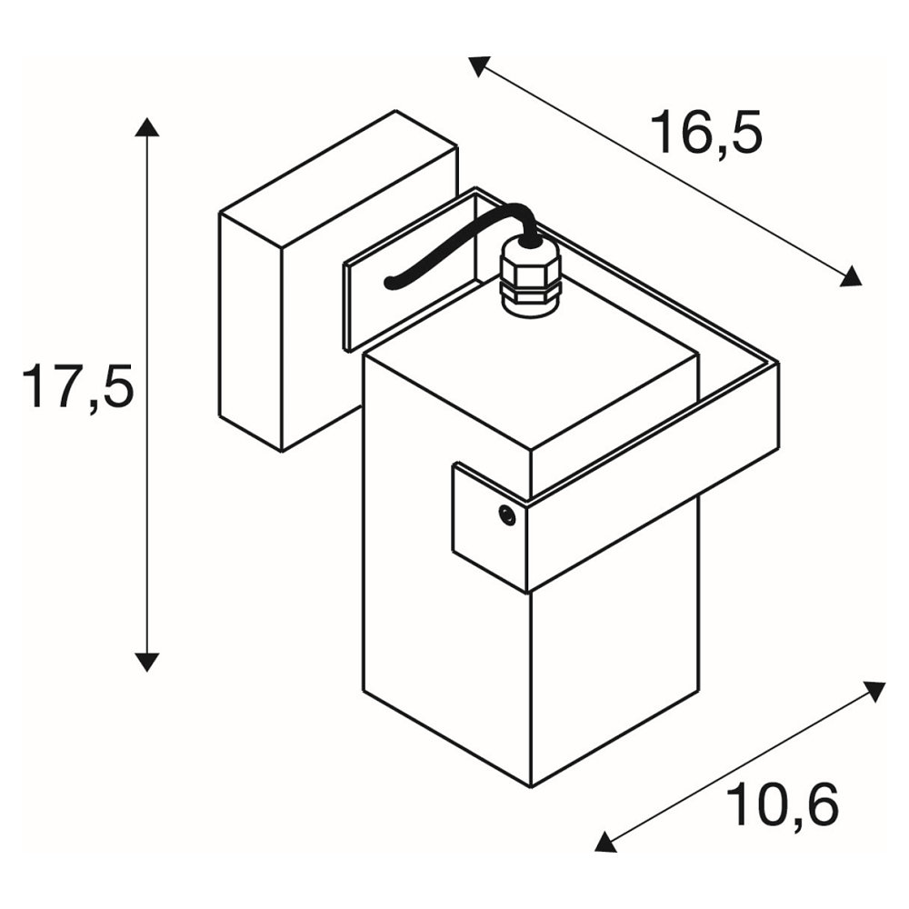 The size of the light is W/H/D: 10.6/16.5/17.5 cm and the bracket measures L/W/H: 9.1/9.1/3.4 cm. The light head is tiltable and offers a swivel range of 340°. The installation is done through surface mounting and the power connection is made via a clamp connection.