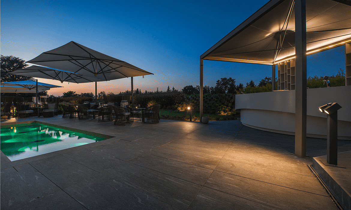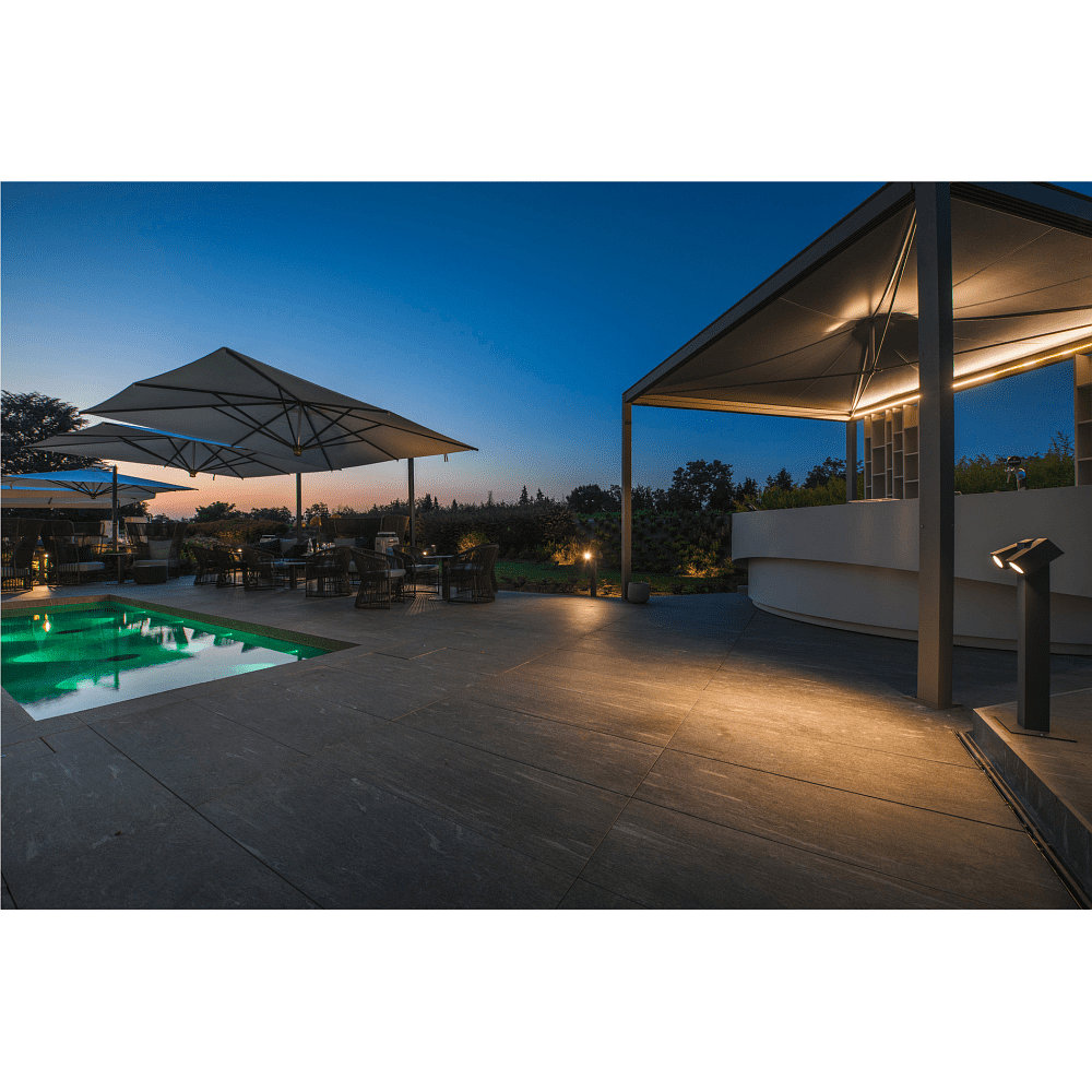 The floor lamp features 2 separately adjustable heads, each of which can be rotated up to +/- 90°. This allows you to individually align the light cones and strategically illuminate specific areas. This ensures optimal lighting for your outdoor area.