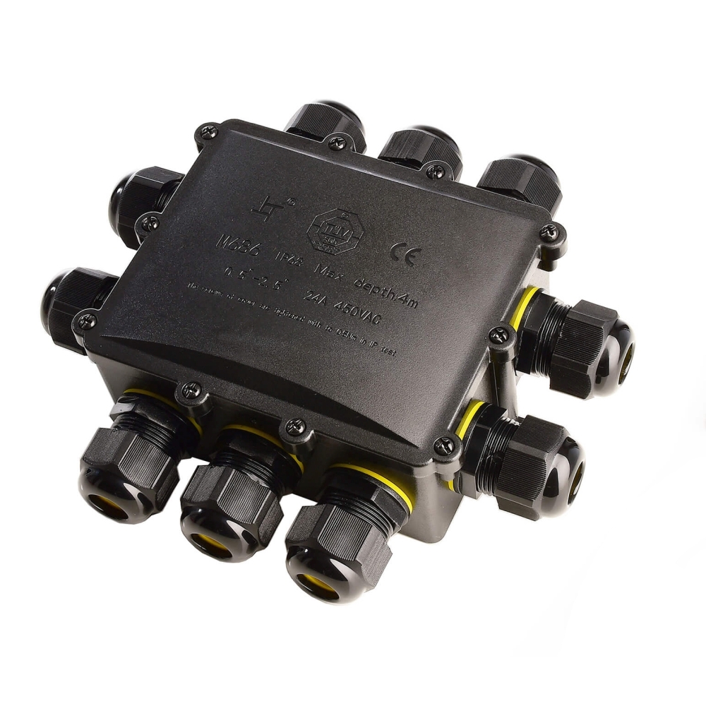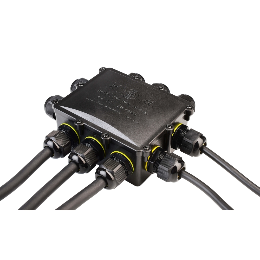 The size of the distributor is W/H/D: 13.53/4.91/18.3 cm. It has an IP protection class of IP68 and is waterproof up to a depth of 2m. The housing color is black, allowing for inconspicuous integration into your surroundings.
