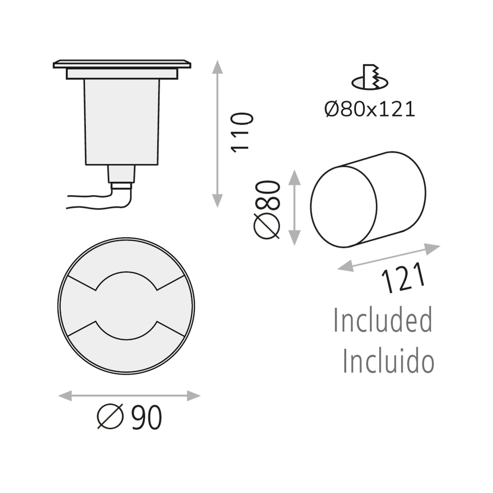 The operating voltage of the floor spotlight INDUS is 100-240V~, allowing for versatile use. The dimensions of the product are Ø 8.8 cm and a height of 12 cm. A recessing depth of 12.1 cm and a mounting opening with a circular Ø of 8 cm make installation easy and straightforward.