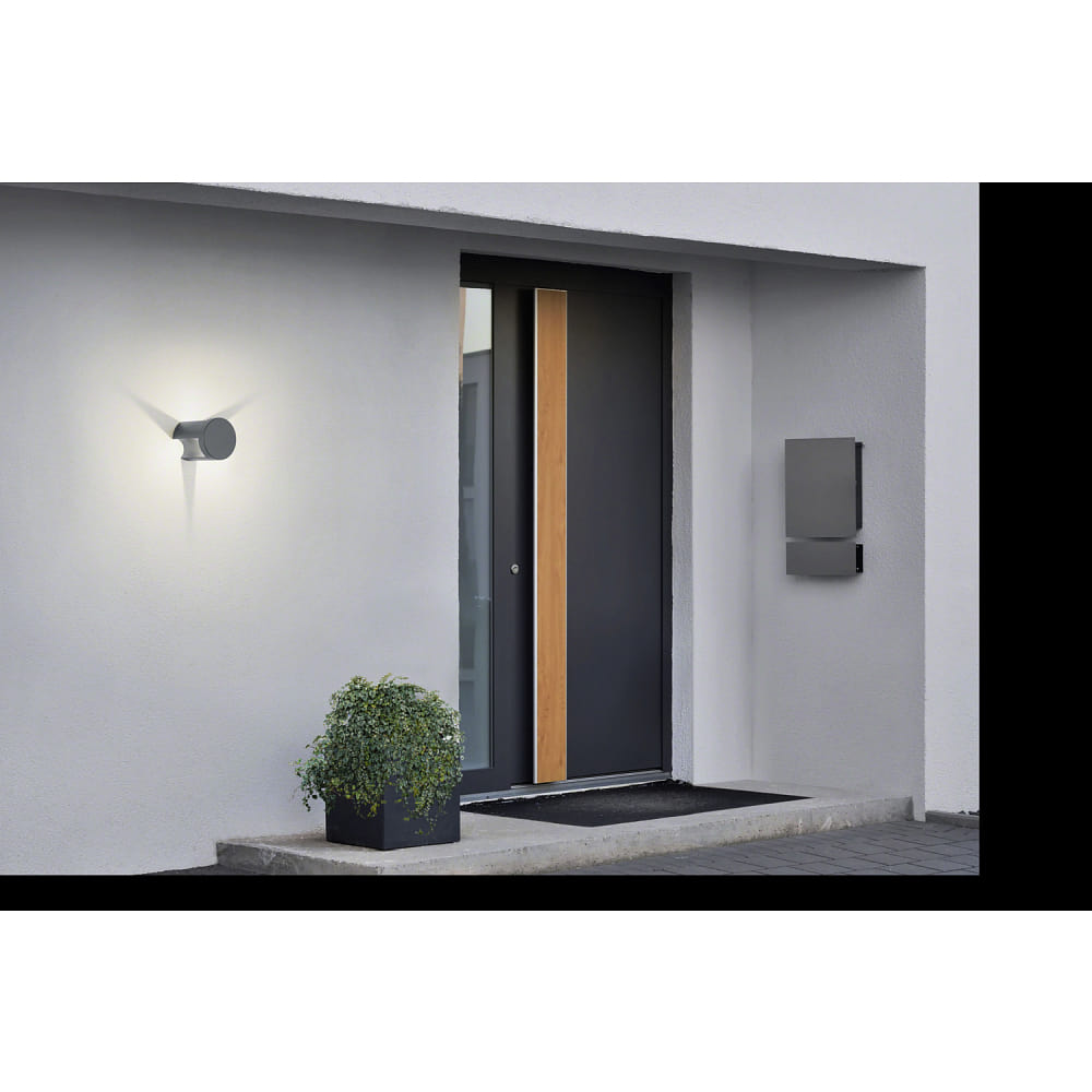 The outdoor wall light SKY by Helestra is a cylindrical, minimalist wall light for outdoor use. With its stable aluminum housing in graphite weather-resistant powder coating, it is not only an eye-catcher, but also particularly durable.