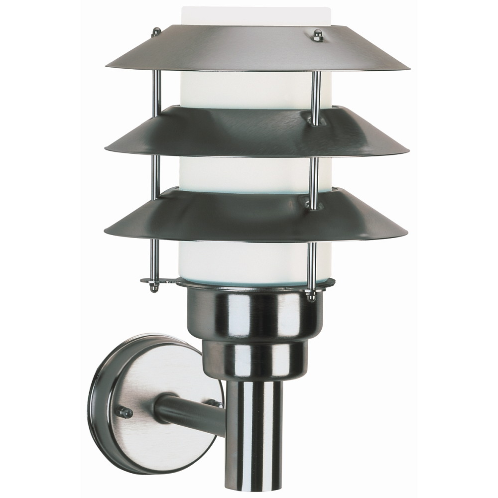 Outdoor Wall luminaire Type No. 0216, with 3 Pagoda roofs, IP44, E27 QA55 max. 57W, stainless steel / opal glass