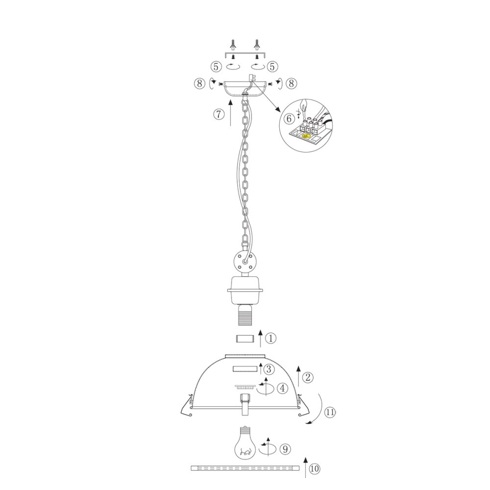 The pendant light BIKKEL is easily mounted on the ceiling with assembly mounting. The canopy has a diameter of 12 cm and a height of 4 cm. The power connection is made via a clamp connection, and the operating voltage is 220-230V~ at a mains frequency of 50/60Hz. The weight of the light is 4.1 kg, ensuring stable and secure mounting.