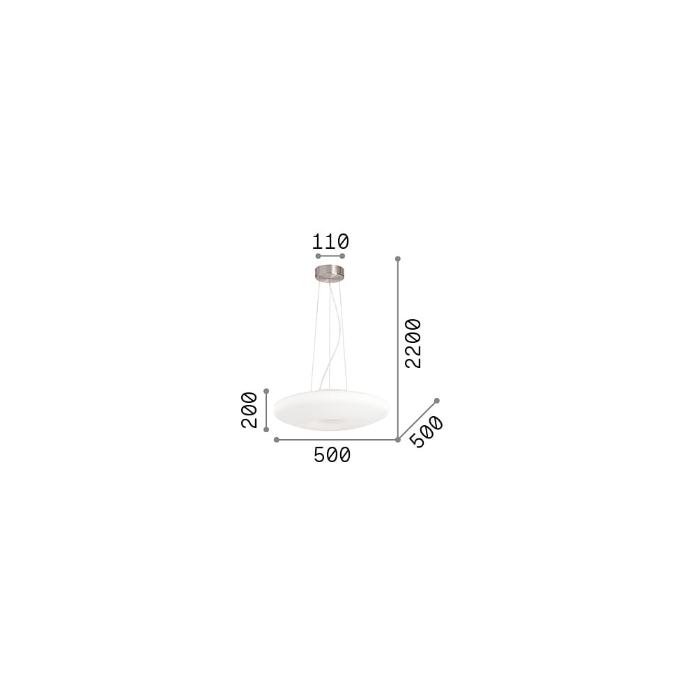 The pendant light operates at a voltage of 220-240V~ and weighs 3.26kg. It is white in color and made of high-quality glass. Thanks to the IP20 protection class, the fixture is protected against dust and touch. The installation is simple and uncomplicated with assembly mounting.