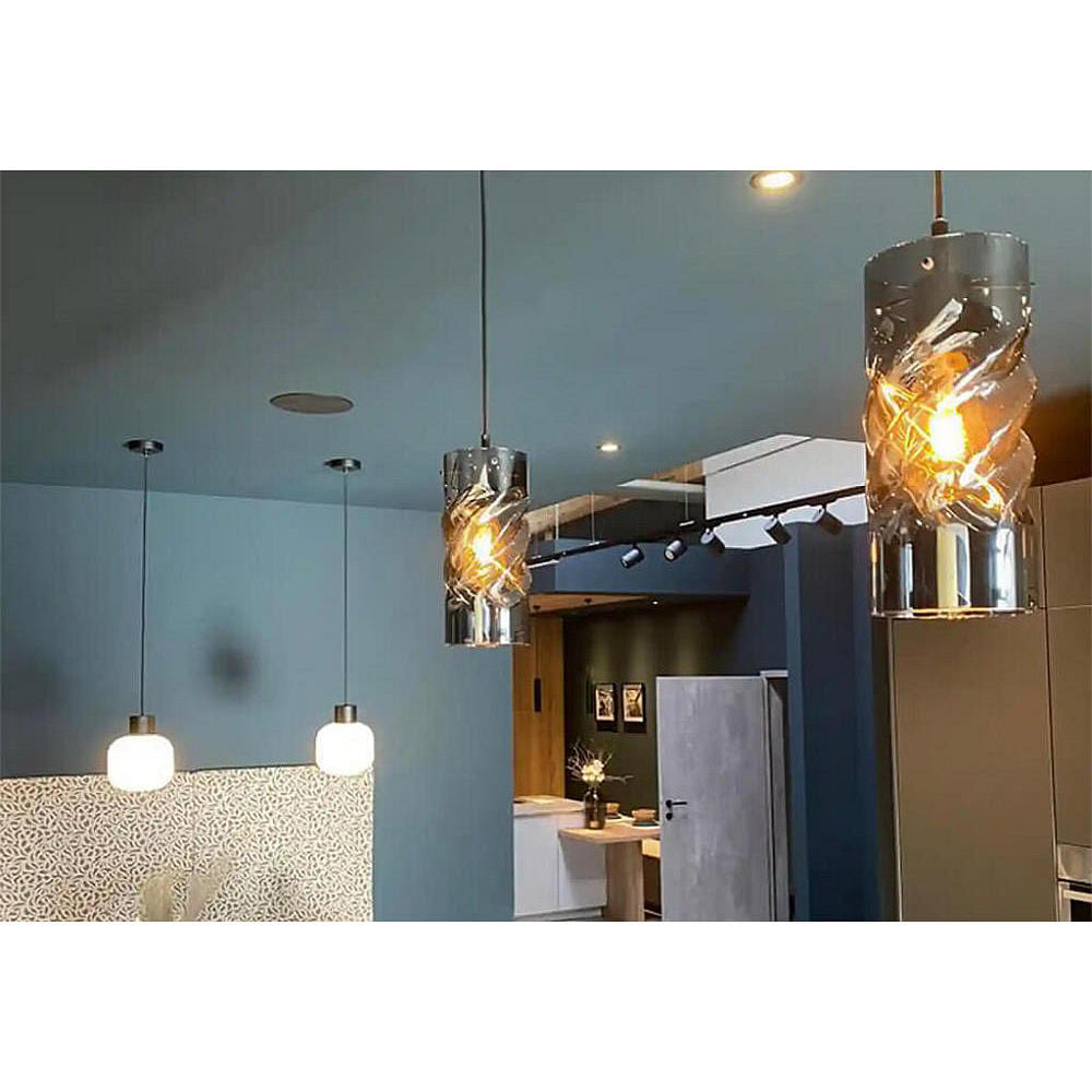 The pendant lamp INFINITY SMOKY CURLED GLASS impresses with its modern yet timeless design. The cylindrical shade made of twisted, clear smoky glass provides a special aesthetic and sets stylish accents in any room. The black aluminum frame perfectly complements the lamp and gives it a noble look. With a diameter of 12 cm and a height of 27 cm, the lamp is compact but still a real eye-catcher.