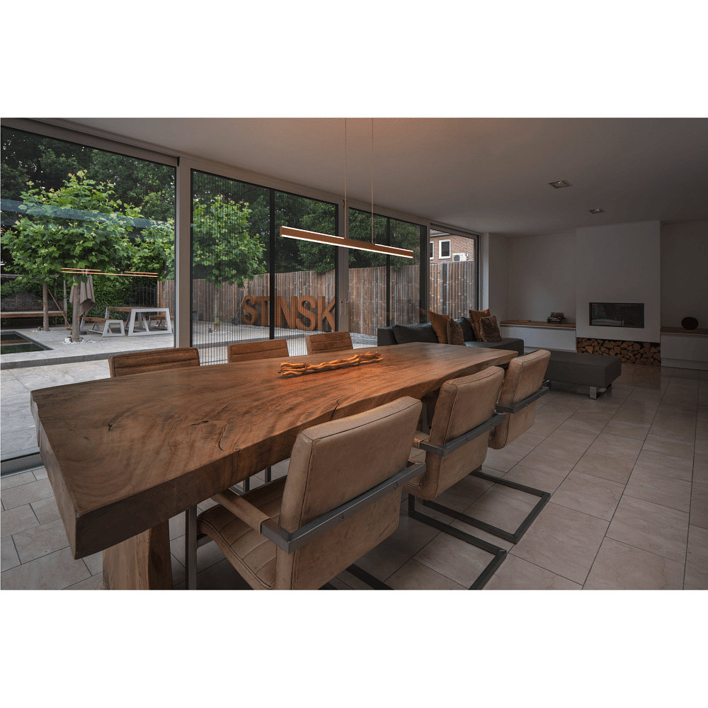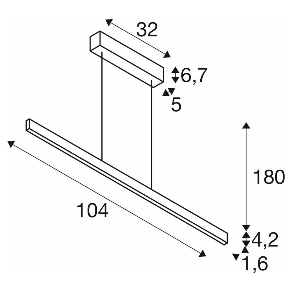 The pendant light comes with a square canopy that includes an LED driver and a downstream low-voltage wire suspension. The light has dimensions of 104 x 1.6 x 4.2 cm and weighs 1.82kg.