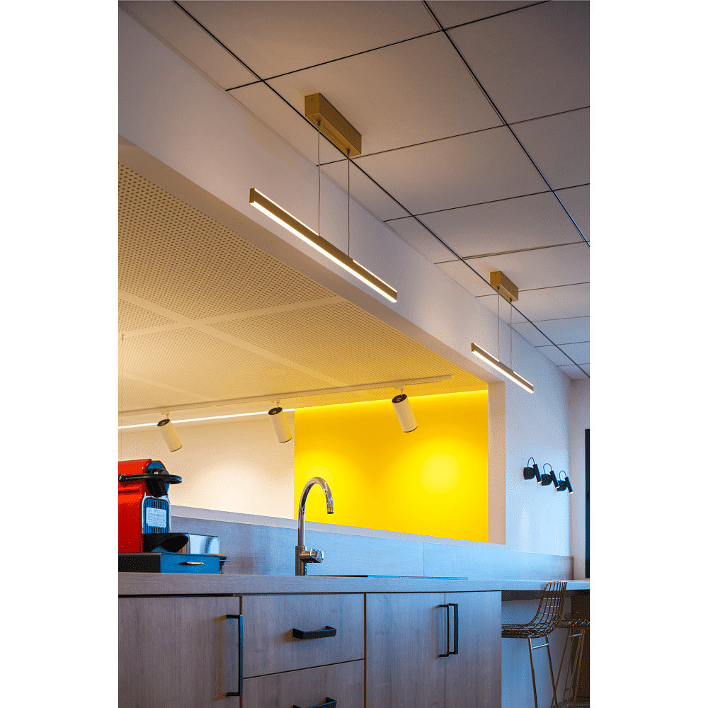 The LED pendant light ONE LINEAR 100 PHASE UP/DOWN is a modern and dimmable light with a slim design. With a power consumption of 24W and a luminous flux of 1280lm, it provides pleasant lighting in your space.