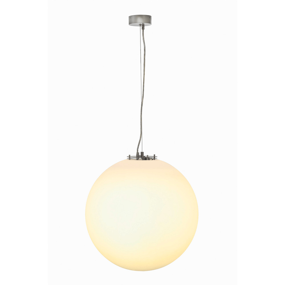 The pendant light ROTOBALL 50 PD from SLV is a simple and elegant lighting solution for indoor spaces. With a total diameter of 50 cm and a weight of 3.6 kg, it fits perfectly in any room. The grey steel housing and the matte PE diffuser provide a soft all-around light distribution.