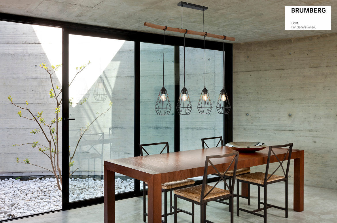 The pendant light RUTILUS from Brumberg is an extravagant and decorative lighting solution for your interior. With a real wood holder and elongated cage shades made of matte black steel, it creates a modern and stylish ambiance in your home.