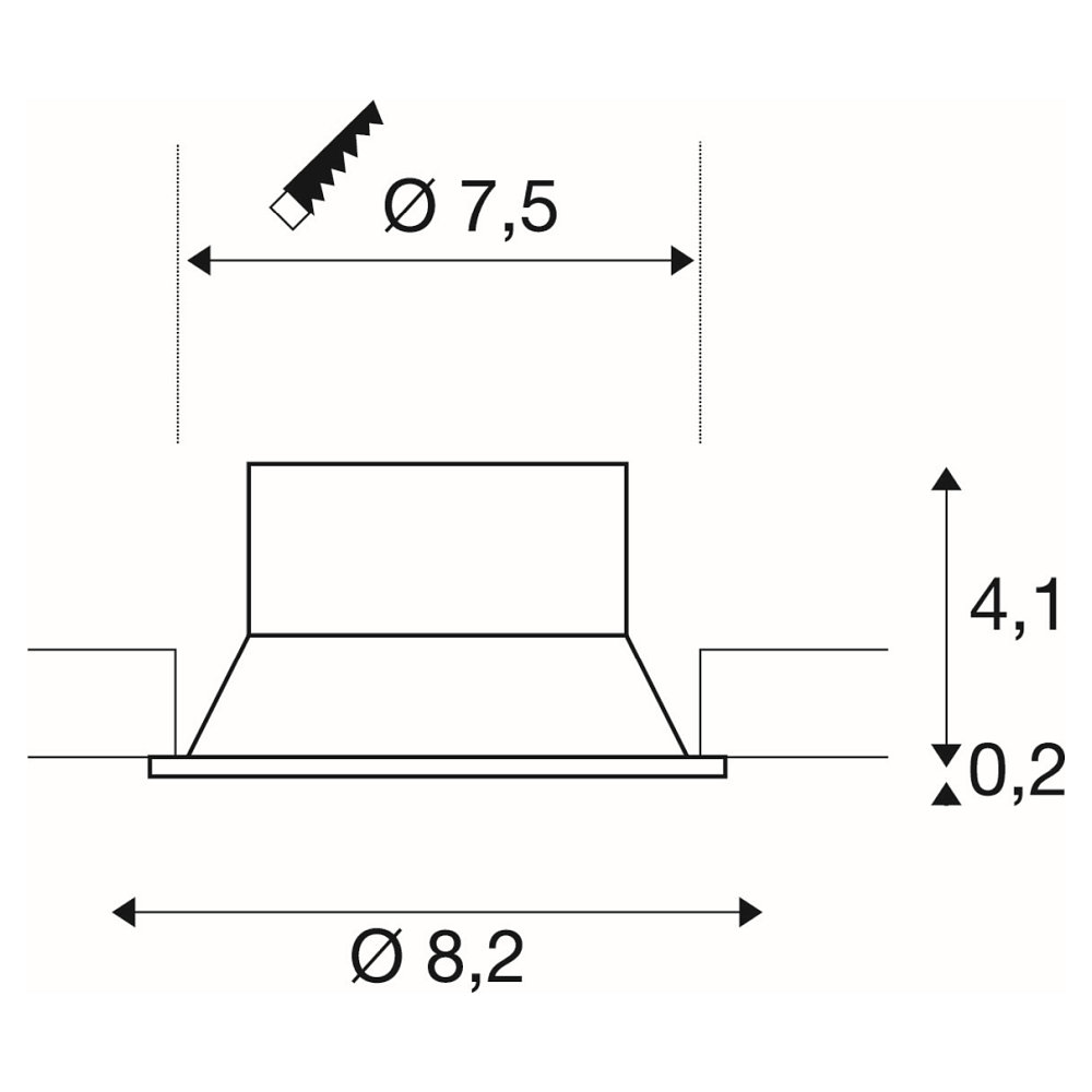 The size of the ceiling recessed light is Ø/L/W/H: 8.2/8.2/8.2/4.3 cm. The circular cutout has a diameter of 7.5 cm. With an IP protection rating of IP20, the luminaire is protected against dust and touch, making it ideal for indoor use.