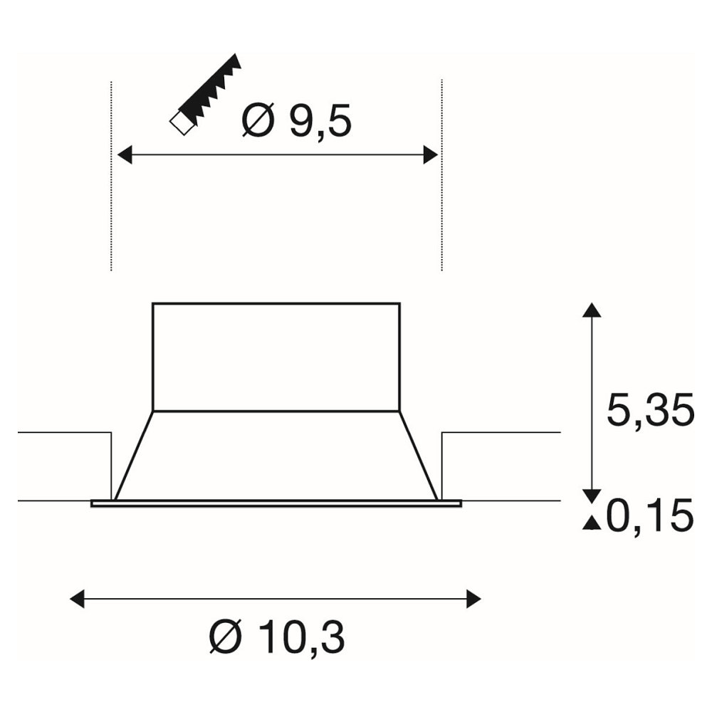 The built-in luminaire has dimensions Ø/L/W/H: 10.3/10.3/10.3/5.5 cm and weighs only 0.11 kg. The installation opening is 9.5 cm in diameter. The color of the ceiling mounting ring is white and is made of high-quality aluminum.