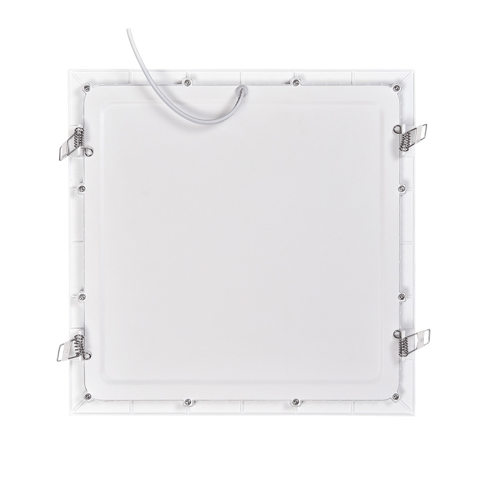 The installation of the panel is done by mounting it into the ceiling with a rectangular opening of 27.8 x 27.8 cm. The scope of delivery includes connection cables, socket, spring clips, and a plug, which facilitate installation. The product uses an operating voltage of 28 volts DC and requires a separate constant current driver with 350 mA, which is not included. The dimming function depends on the driver used and allows integration into smart building controls when using a DALI-compatible driver.