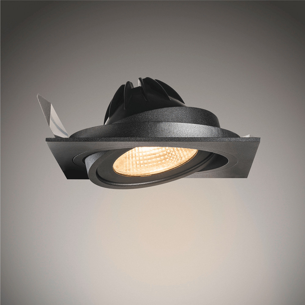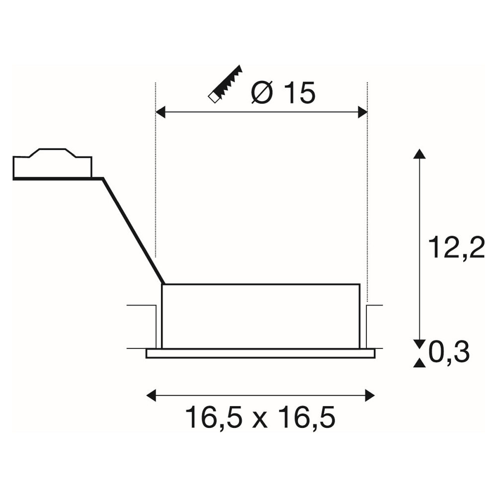 The fixture has a swivel range of 30° to adjust the light direction. The installation opening has a rectangular shape with a length and width of 16.5 cm each. The recessed ceiling spotlight is suitable for ceilings with a material thickness of up to 30 mm.
