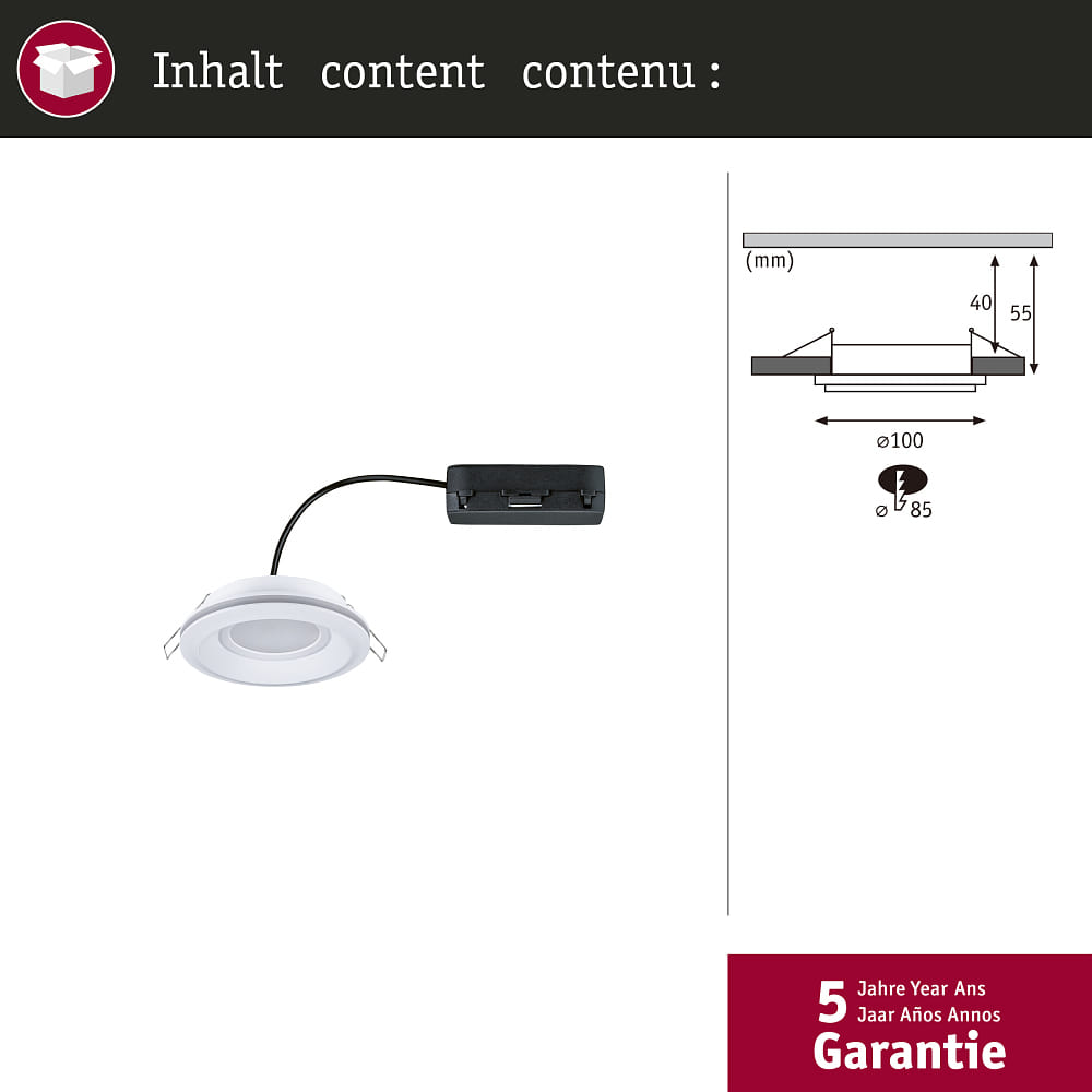 Thanks to its compact size of Ø 10 cm and a height of 3.3 cm, the LED recessed spotlight SORMUS fits into many different installation situations. The recessed depth is 4 cm, making it easy to install the recessed spotlight.
