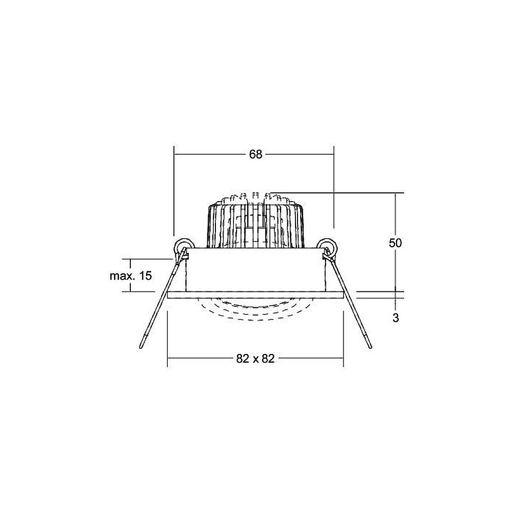 The TIRREL-S recessed spotlight has a square shape and a size of 8.2 x 8.2 x 5.3 cm. The visible part of the spotlight is only 0.3 cm thick. Installation is done by recessing, and accessories such as control gear, clip springs, and connecting cables are included.
