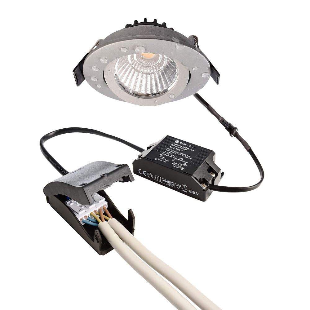 Installation is particularly simple and fast thanks to the tool-free quick-installation junction box with push-in terminals. The junction box is included in the delivery and also allows for through wiring with NYM 3x 1.5 mm² cables. Additionally, clip springs for secure mounting and an external dimmable LED driver are included. The fixture is compatible with conventional phase-cut dimmers, allowing flexible control of light intensity.