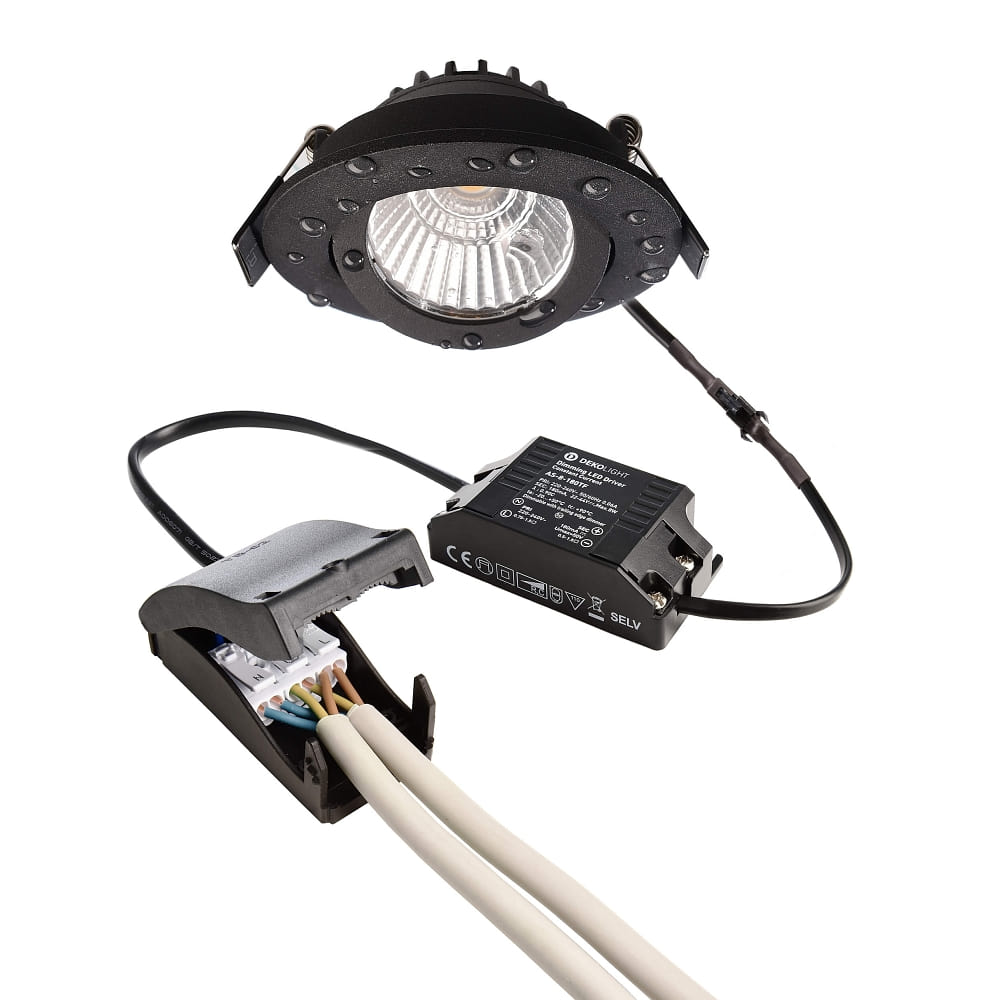 The installation is done as a recessed luminaire in standard drill holes with a diameter of 6.8 cm. The installation is significantly simplified by the included accessories such as the connection box, driver, spring clips, and through-wiring. The connection box with quick-terminal guarantees tool-free, fast wiring and also supports through-wiring with common cable types. The spring-mounted clips ensure a secure hold of the luminaire in the ceiling.
