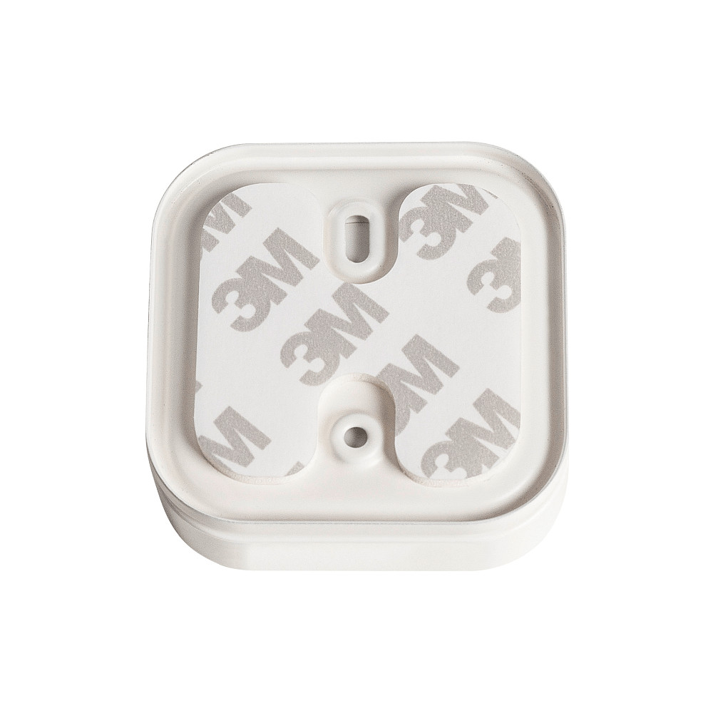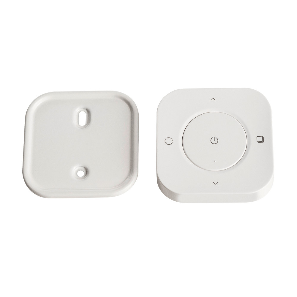 The remote control has dimensions of 6.5 x 6.5 x 1.95 cm and weighs only 0.068 kg. It is designed for wall mounting and has an IP20 protection rating. The remote control is battery-powered and made of high-quality plastic.