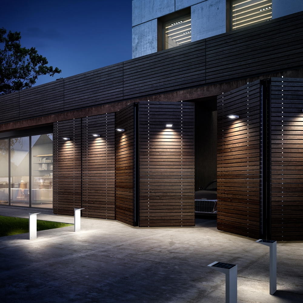 The solar floor lamp comes with a ground spike and a driver, making installation quick and straightforward. The lamp is specifically designed for ground mounting and its angular design fits perfectly along various paths or entrance areas. Additionally, a matching wall lamp is available to perfectly complement the lighting concept. This allows for creating a harmonious lighting atmosphere with modern solar technology.