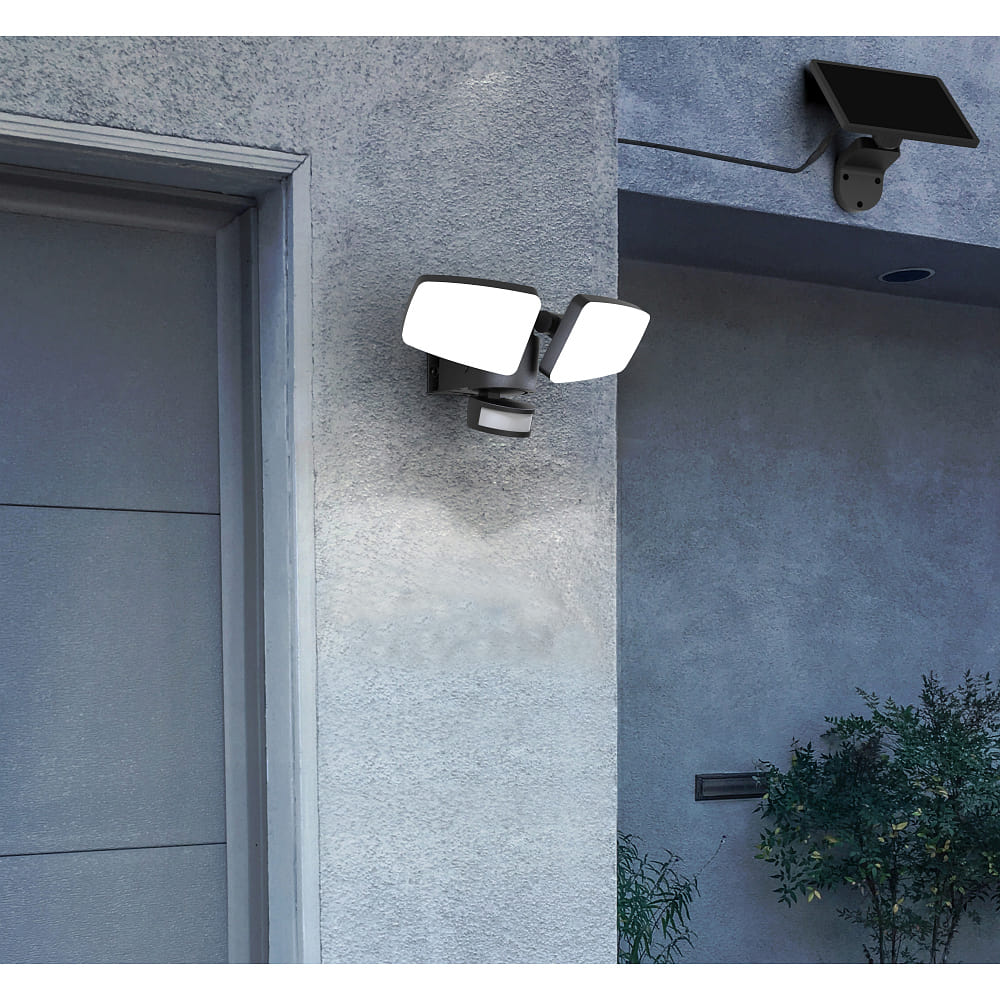 The Solar LED Double Floodlight DUPLEX does not require a power connection as it is autonomously charged via a solar panel. Thanks to the integrated sensors and switches, the settings for motion detection and twilight can be individually adjusted. It also has a large action radius with separately swiveling and rotating light wings.