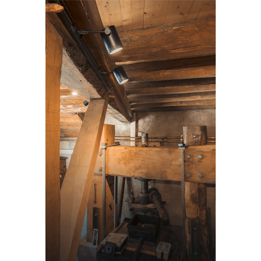 The spotlight is made of black aluminum and features a spot with a diameter of 6 cm. The compact design and the side joint on the lamp head ensure a particularly large tilt range. The shape of the lamp is round and harmoniously fits into any room concept.