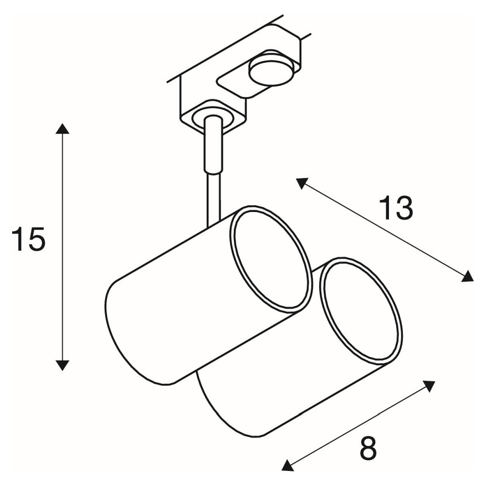 The 3-phase spotlight BIMA 2 is part of the BIMA track spotlight series and is characterized by its compact design. The two spots can be rotated together and tilted separately, allowing for a particularly large tilt range. The use of halogen light sources requires a mounting height of over 250cm and a distance to illuminated surfaces of over 50cm.