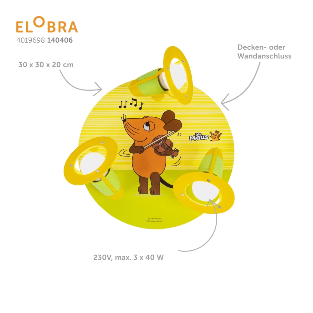 The Spot Rondell MAUS by Elobra is a stylish ceiling light that operates with three E14 light bulbs. With a maximum power consumption of 3x 40W, this light provides pleasant illumination in your space. The colors green and yellow give the Spot Rondell MAUS a modern and fresh design.