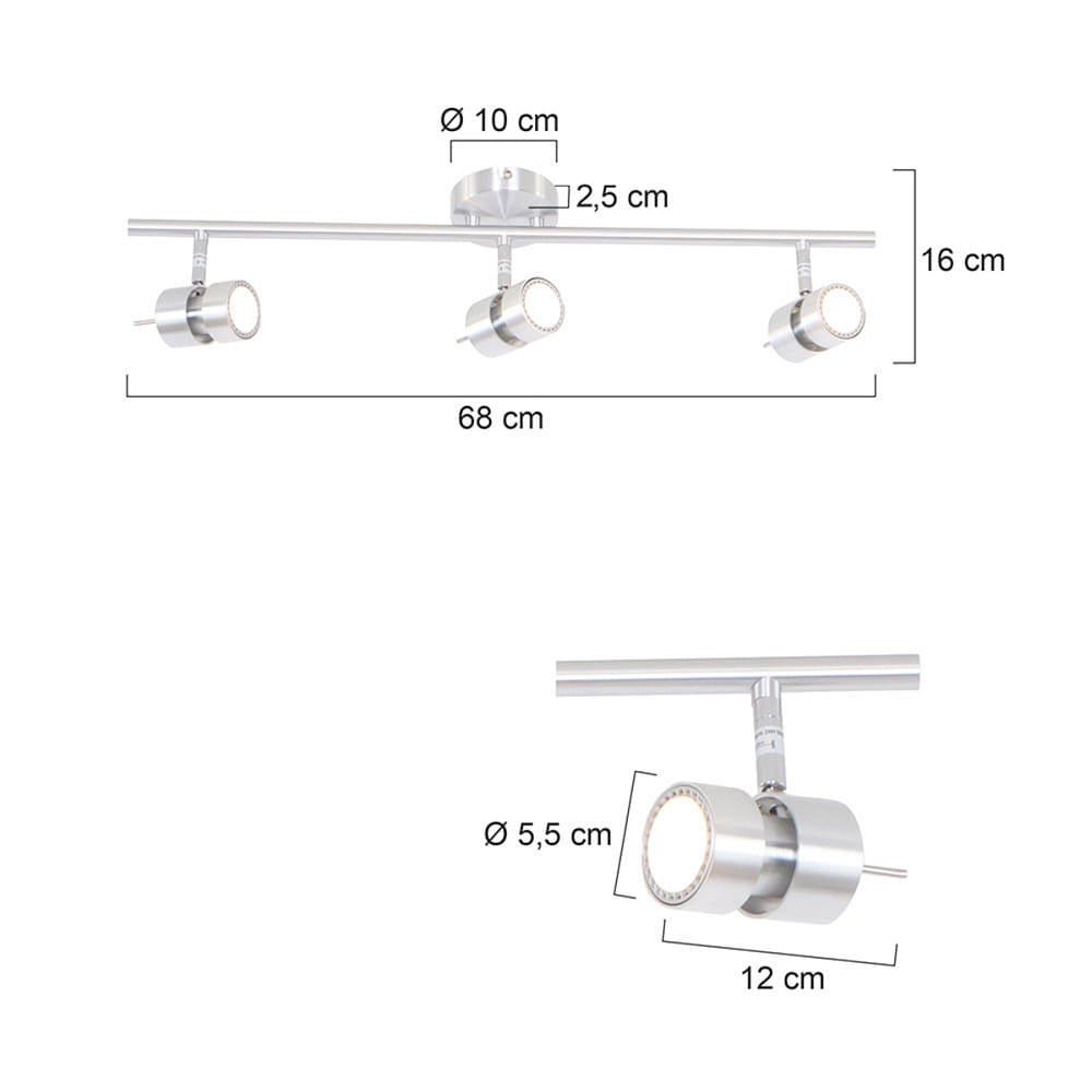 The surface-mounted spotlight bar has a total size of 68 x 16 x 12 cm and weighs 1.3 kg. The spot diameter is 5.5 cm and the ceiling connection diameter is 10 cm. With an energy efficiency class F and an energy consumption of 21 kWh/1,000 h, the luminaire is not particularly energy-efficient, but still offers good lighting quality.