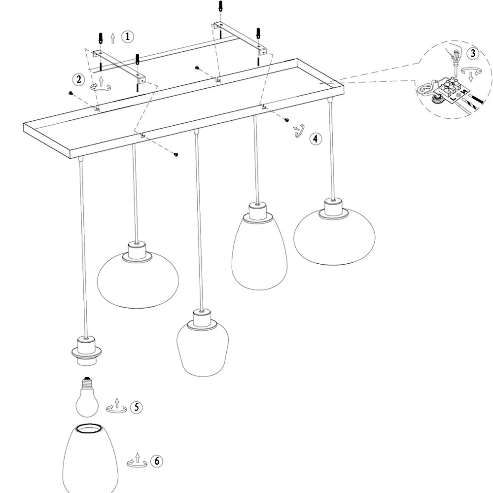 The pendant light can be easily assembled and mounted on the ceiling. With a shade diameter of 13, 15, and 23 cm and a canopy of 100 x 25 x 2.5 cm, it harmoniously fits into any decor. The IP20 protection rating and the clamp connection ensure a safe and reliable power connection.