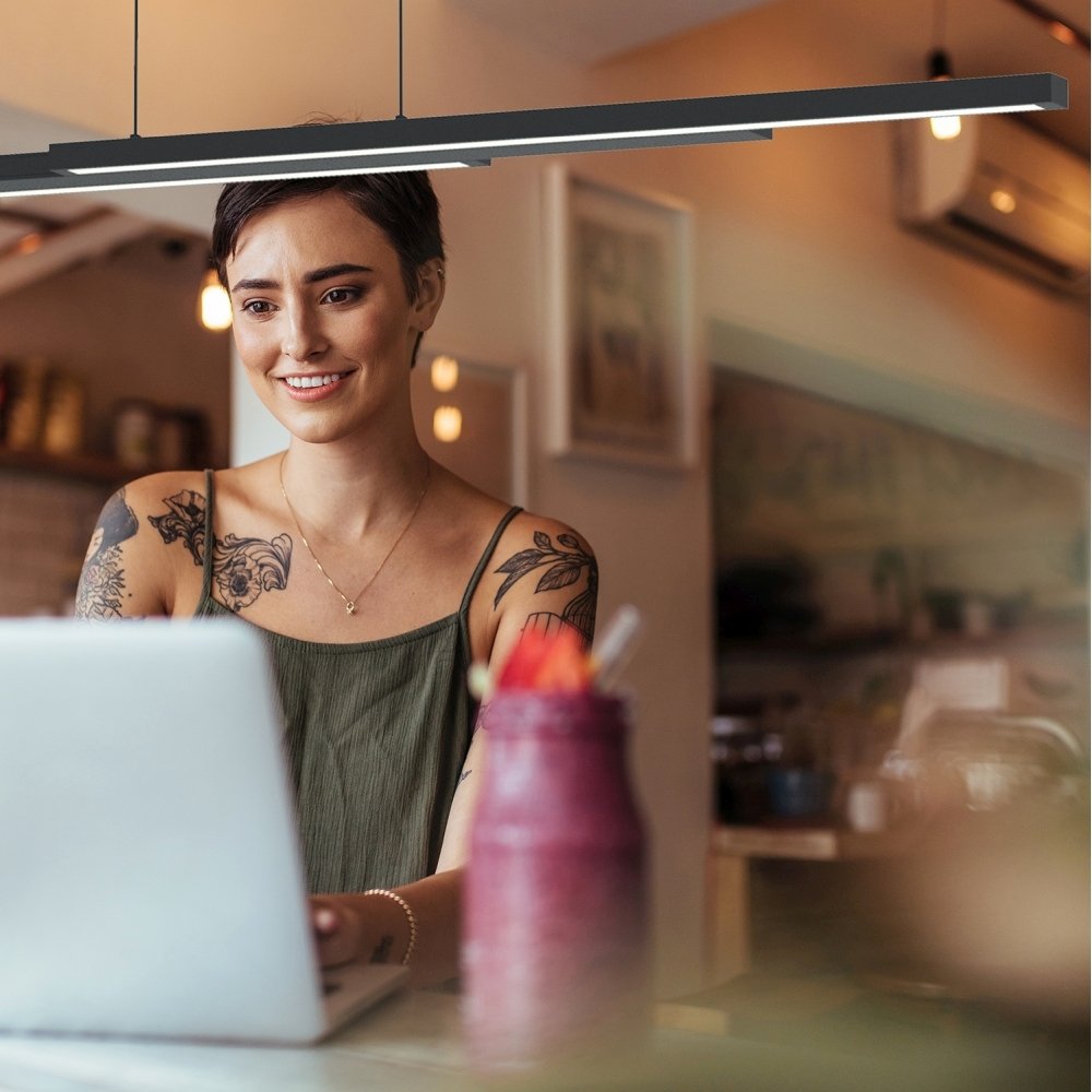 Thanks to the height-adjustable function and extendable length of 80-140cm, the pendant light ZELENA can be flexibly adapted to the respective requirements. It is ideal for use in the dining room, office, or other indoor areas.