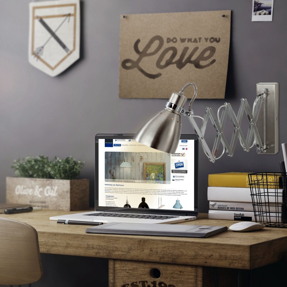 The wall light SPRING with scissor armature is a high-quality and versatile light in industrial style. With its adjustable design and integrated dimmer, it offers a practical solution for lighting various rooms. With its timeless design and easy operation, it is a great addition to any home or office.