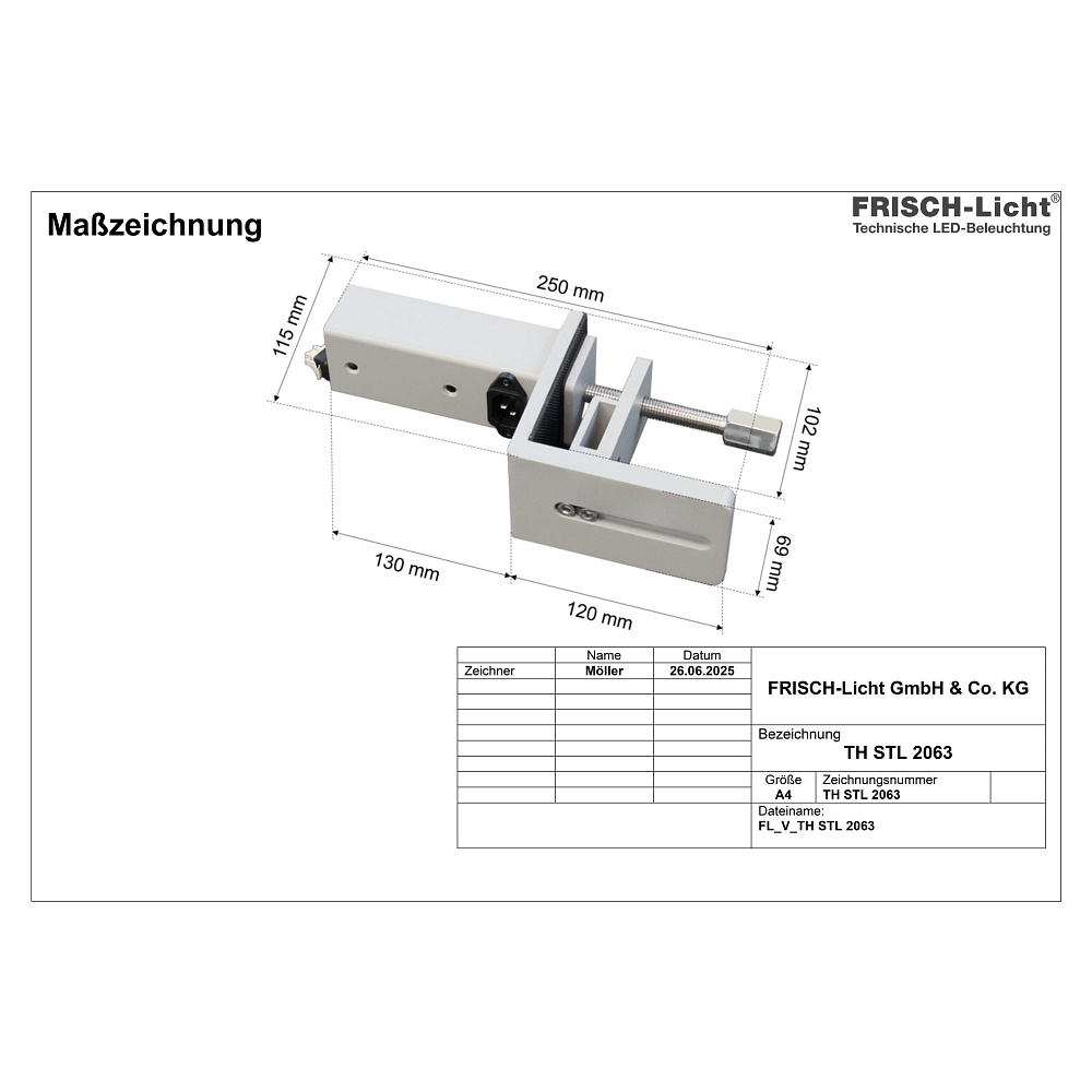 The desk mount FL-THSTL2063 from FRISCH-Licht® is a well-designed accessory specifically made for LED office floor lamps. It allows for secure and stable attachment of the lamp to tabletops with a material thickness between 1.2 cm and 8 cm. Thanks to its robust metal construction, the mount provides a durable and reliable solution for your workplace lighting.