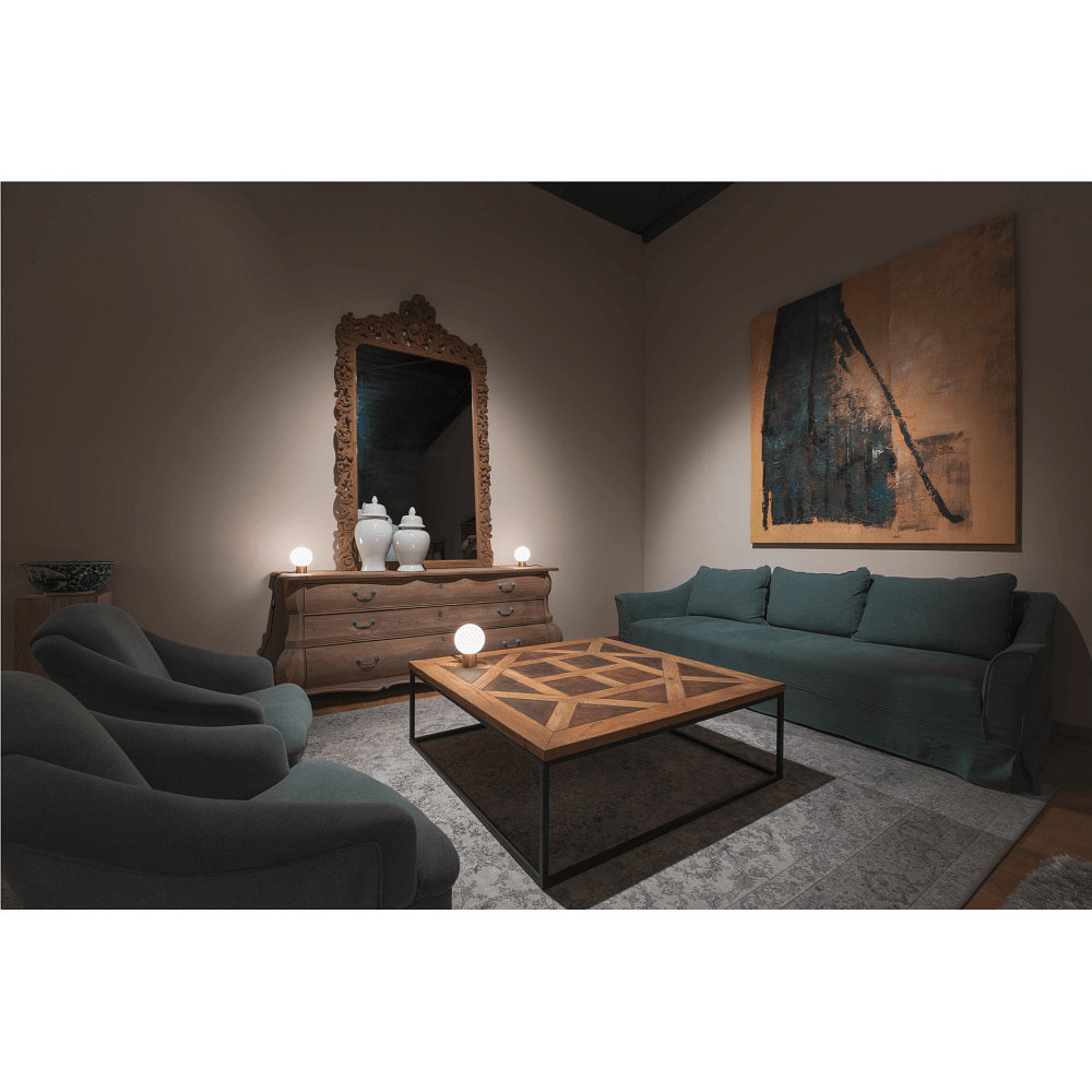 The table lamp LITTLE SUN is a stylish lighting element for your interior. With a size of Ø 14 cm and a height of 19.3 cm, it fits perfectly on any table. The elegant copper design gives your room a warm and cozy atmosphere.