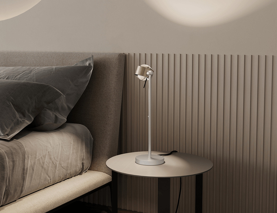 The lamp head, with a diameter of 8 cm, is both swiveling and rotatable, allowing for individual adjustment of the light. This enables the light to be directed exactly where it is needed. This feature makes the table lamp especially practical for various applications, from focused task lighting to atmospheric accent lighting.