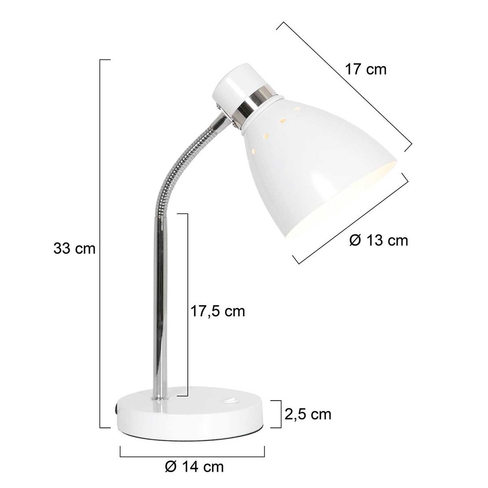 The table lamp SPRING is an elegant lighting element for indoor use. With dimensions of 13 x 33 x 14 cm, it fits perfectly on any table and creates a pleasant atmosphere. The shade has a diameter of 13 cm and is made of high-quality white metal.