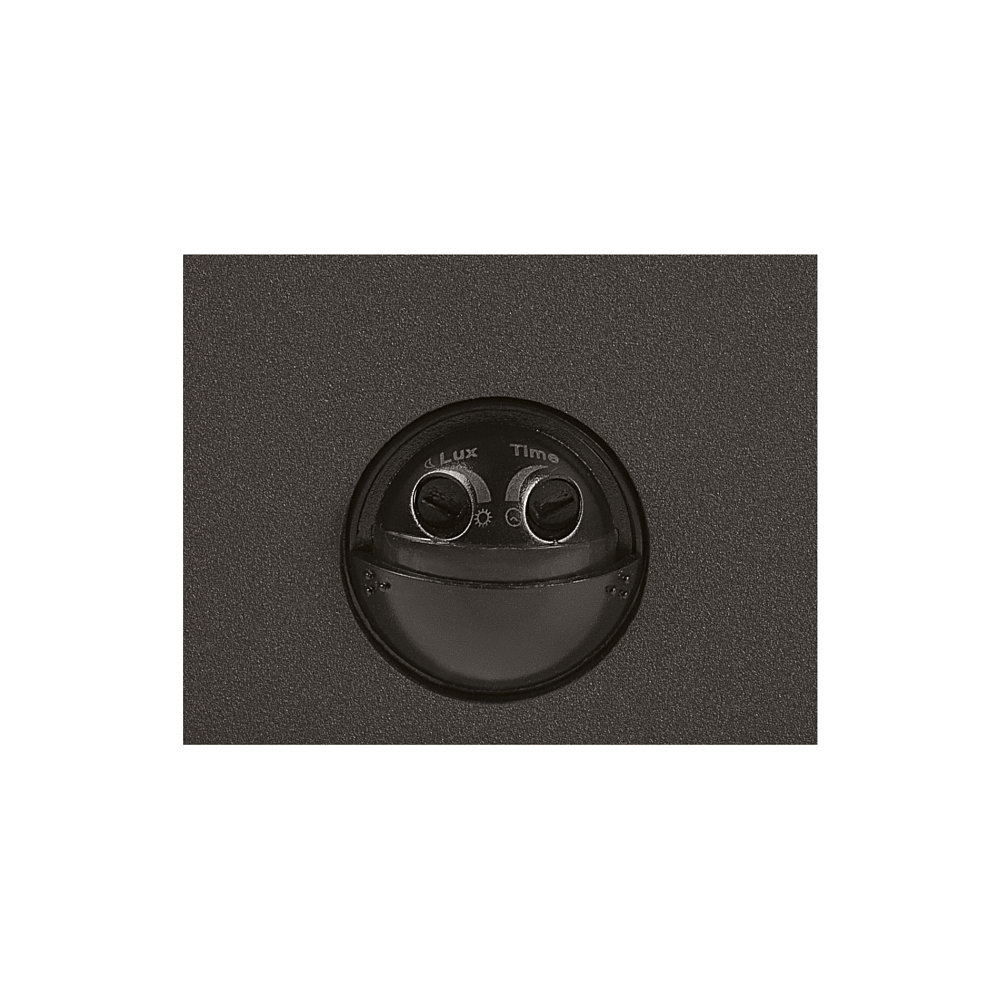 This outdoor wall light features a motion sensor and a twilight switch, which are individually adjustable. The detection angle is 120 degrees and the range is between 6m and 9m. The timer setting ranges from 8 seconds to 8 minutes.