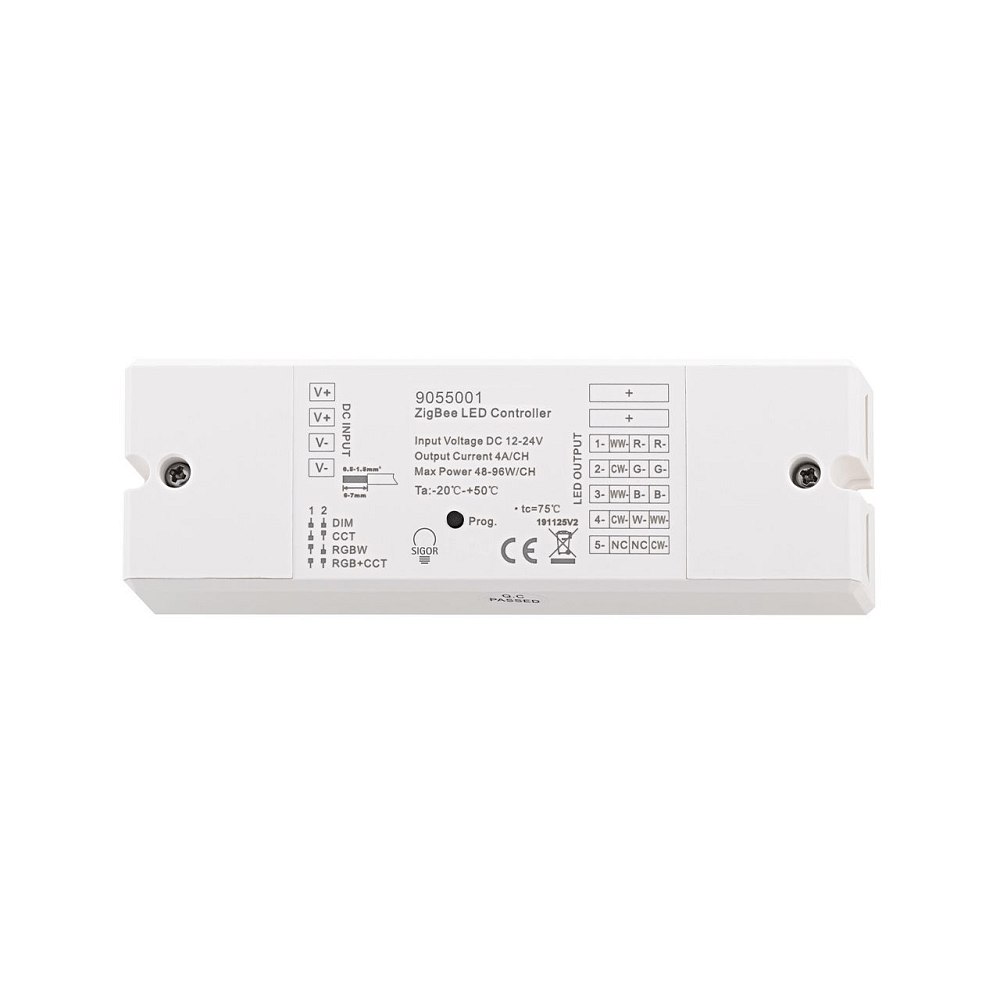 The ZigBee receiver allows for the control of LED strips with a total of 5 channels. With a power of 5x 4A and an operating voltage of 12-24V DC, you can easily control up to 48W (at 12V) or 96W (at 24V) of LED lighting.